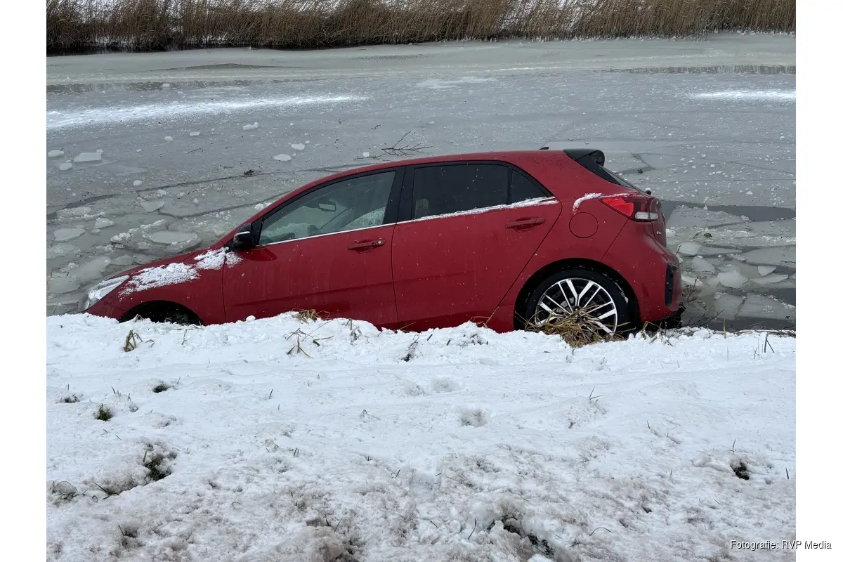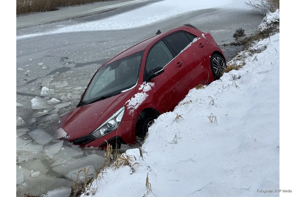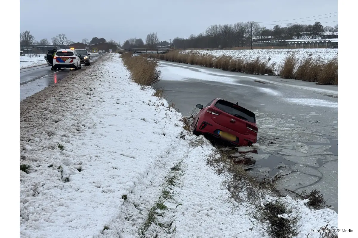 De bestuurder verloor door de sneeuw en gladheid de macht over het stuur en raakte te water. Hij kon zelf de auto verlaten en werd door de ambulancedienst behandeld. Een rit naar het ziekenhuis bleek niet nodig.