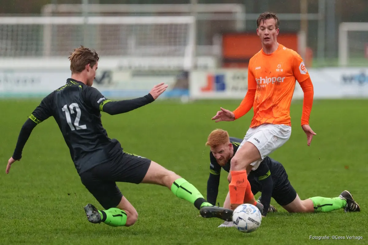 SPANBROEK/AKERSLOOT - Onder gure weersomstandigheden hebben VVS '46 en De Valken zondag voor het nodige spektakel gezorgd in de derde klasse A. In een wedstrijd met liefst negen doelpunten trokken de gasten aan het langste eind. In dezelfde klasse wist Grasshoppers te verrassen door de uitwedstrijd bij koploper Meervogels '31 te winnen.